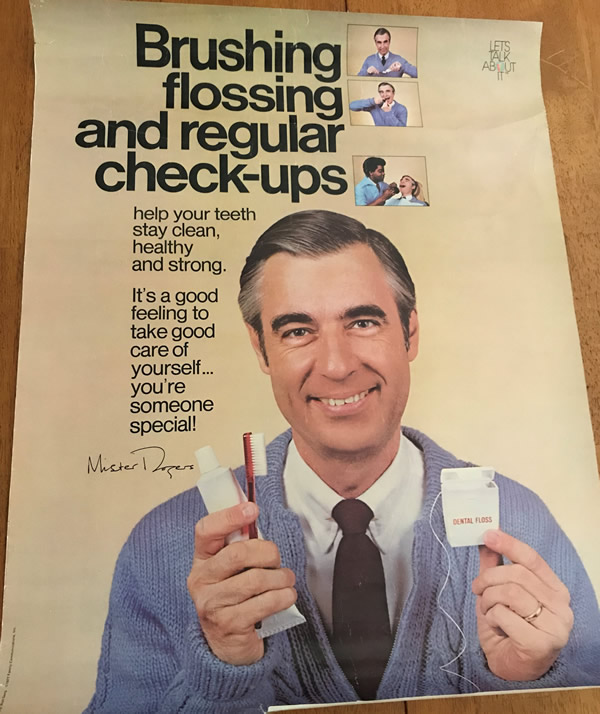 Brushing and Flossing PosterDate: 1977 DescriptionPoster measures 24" x 18" Text reads as follows: "Brushing, flossing and regular check-ups help your teeth stay clean, healthy and strong. It's a good feeling to take good care of yourself -- you're someone special!" Design by: Frank D'Astolfo