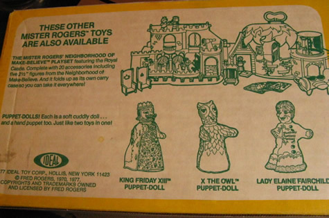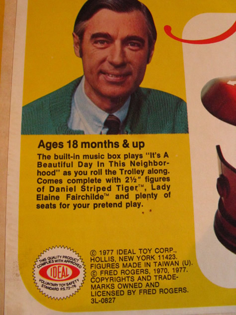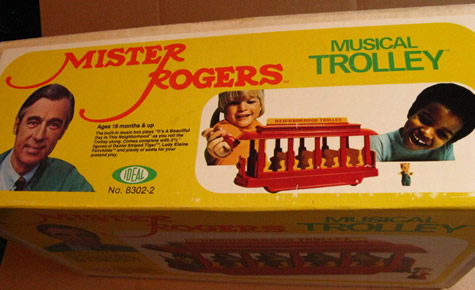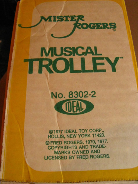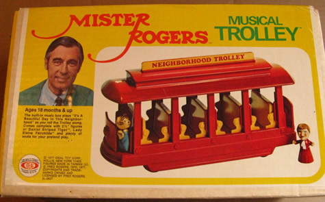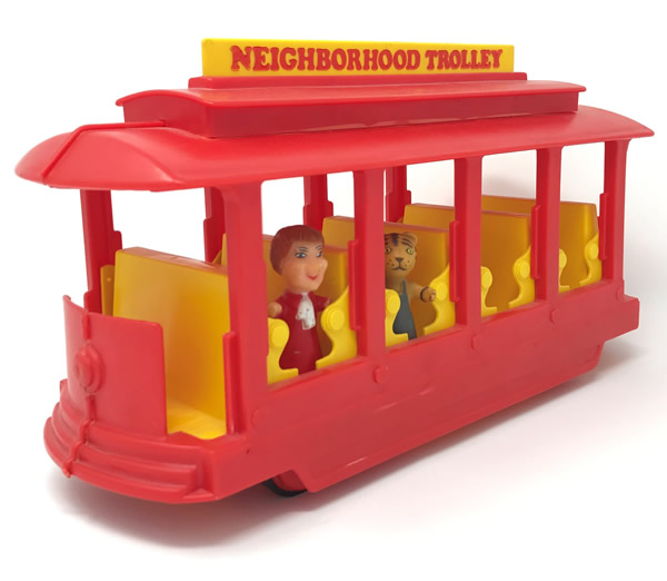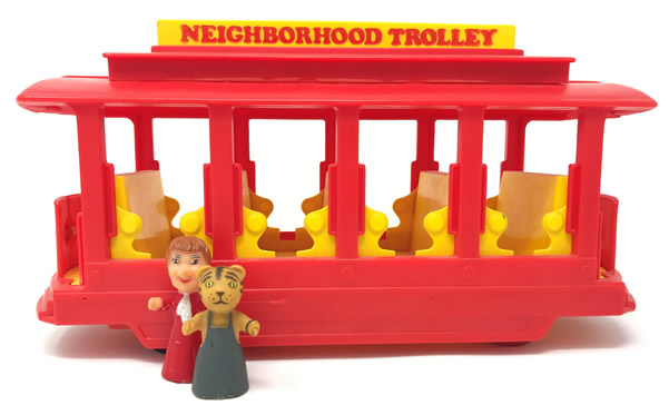Musical TrolleyDate: 1977 © 1977 Ideal Toy Corp. DescriptionThis toy was made in 1977 by Ideal Toy Corporation. "Comes complete with 2 1/2" figures of Daniel Striped Tiger, Lady Elaine Fairchilde, and plenty of seats for your pretend play." NotesThe Musical Trolley can be seen sitting atop Don Brockett's piano in a scene from Don Brockett's Pittsburgh. This item can be found in the 1977 Ideal Toy Company Promotion Guides