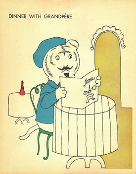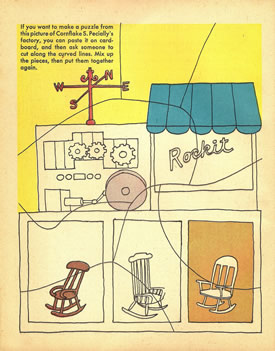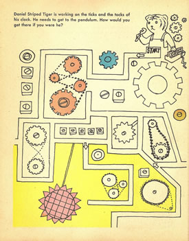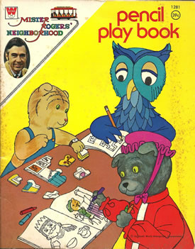 The cover of the Pencil Play Book features Daniel, X, and Henrietta working on actual activities from this book. As you can see, Daniel is piecing together the Rockit factory puzzle while Henrietta is busy coloring the picture of Grandpere out to dinner (with a spoonless King Friday on the opposite page). It is unclear what X is working on as the image on his page does not clearly match any of the pages in the book.