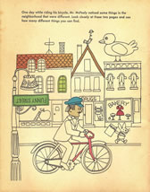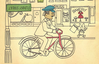 In the many illustrated publications from the Neighborhood, it is quite uncommon to find a drawing of one of the human characters. Below we see Mr. McFeely riding his bicycle down a "funny street."