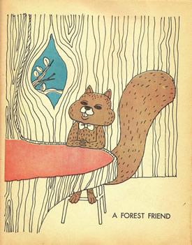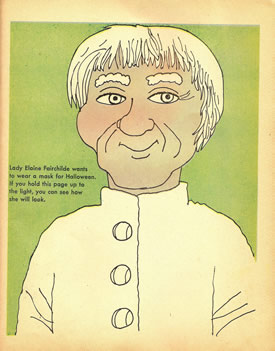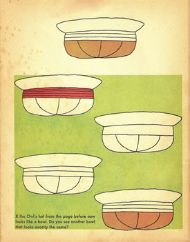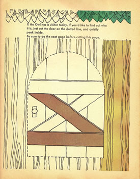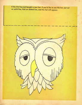 Some of the activities require a bit more than a pencil to complete. For example, in the activity seen below, Lady Elaine wants to wear a mask for Halloween. Printed on the back side of this page is a black mask which becomes visible when held up to the light. Run your mouse over the image to the left to see Lady Elaine in costume. Another multi-page activity involves a visitor to X's tree. By cutting the door on the dotted line, children are able to see to the next page which shows X's "forest friend." Place your mouse over the image to the left to open the door. Finally, the last activity in the book requires a very simple cut and fold of the page to place a hat on the head of X the Owl. Place your mouse on the first image below to see X wearing his hat. Appearing In This Book |
