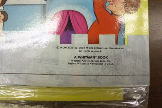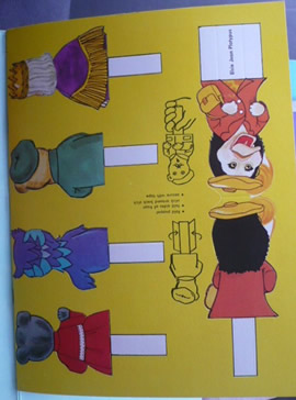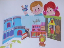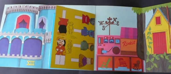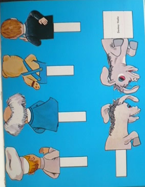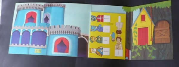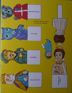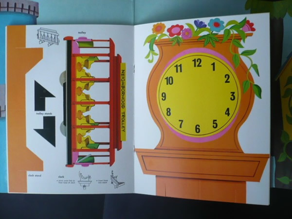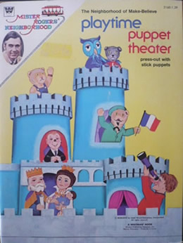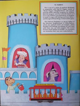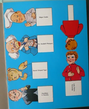 The images below show the details of the fold-out background complete with King Friday's castle, X and Henrietta's tree, Corney's factory, and Daniel's clock. Strangely absent from the scenery is the Museum Go-Round, although Lady Elaine Fairchilde is included among the puppets. Daniel's clock comes in the form of a punch-out as does the Neighborhood Trolley. The characters themselves are very similar to those found in the Mister Rogers storybooks published around this same time -- in fact, the illustrator may very well be the same person. As you can see, the stick puppets were done quite well as a less-detailed version may not have included a view of each character's back. Once each piece was removed, the front and back pieces were placed together. The base of the front piece wrapped around that of the back forming a "stick" with the character's name on the front. Included were King Friday XIII, Grandpere, X the Owl, Henrietta Pussycat, Queen Sara Saturday, Mrs. Platypus, and even a small Prince Tuesday that could be hooked into the arms of his mother...