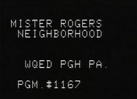 Episode CreditsProduced by WQED Pittsburgh, Pennsylvania in association with Small World Enterprises Inc. for N.E.T. Created by Fred Rogers Production funds for this television visit were provided by a grant from the Sears Roebuck Foundation and the Corporation for Public Broadcasting © 1970 National Educational Television and Radio Center |