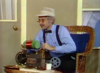 At the McFeely house, Mr. McFeely has his own crystal radio set up already and shows Mister Rogers how it works. After just a few moments, Mr. McFeely is able to get Mister Rogers' radio working properly. While the McFeelys and Mister Rogers listen to You've Got To Do It on the radio, they watch an animated film that Mr. McFeely thought would go nicely with the song. Mister Rogers is invited to stay for some milk and cookies as he talks with the McFeelys about how there was no television when they were young. Returning to his house, Mister Rogers sings Many Ways to Say I Love You. In the Neighborhood of Make-Believe, Handyman Negri is preparing to put together King Friday's television kit. He follows the instructions precisely but still had difficulty getting the television to turn on. When Corney suggests that they plug the set into an electrical outlet, the television works properly and Handyman Negri is congratulated by King Friday for a job well done. NotesLet's Be Together Today plays in the background as the episode transitions to the McFeely house and You've Got To Do It plays as it goes back to Mister Rogers' house. As Corney looks at the television set in Make-Believe, I'm a Man Who Manufactures plays in the background. The radio announcer introduces Mister Rogers' song: "And now let's listen to some music. We have a favorite song of children of all ages from a fine gentleman in the Neighborhood -- Mister Rogers -- singing You've Got To Do It." The animated film is also shown in Episode 1217 and Episode 1242. Shortly after Mr. McFeely takes down the antenna from his porch post, one of the small evergreen trees at the base of the porch topples over. Appearing In This Episode