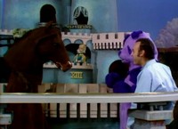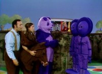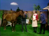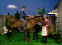 Mr. McFeely stops by with a board from the lumber yard which Mister Rogers uses with the carpenter's horses to make a table. Using just one of the horses with the board, he creates a seesaw for the rag dolls. Mister Rogers is invited to Mr. McFeely's home where Mrs. McFeely is caring for a horse while its owner is away. Returning to his house, Mister Rogers comments on the height of horse and measures various items using a yard stick. In the Neighborhood of Make-Believe, Handyman Negri is playing hide-and-seek with Purple Panda. King Friday XIII is startled when he sees Purple Panda but quickly finds that he is a friendly visitor. Lady Aberlin arrives at the castle with a horse costume which she and Handyman Negri wear as they challenge Purple Panda to a race. At the finish line -- the Museum-Go-Round -- Paul and Pauline Purple appear and demonstrate their Purple way of traveling. To travel the Purple way, one must simply think about where they want to be in order to arrive. Back at the house, Mister Rogers talks about the many things people can do by thinking. He concludes by singing Children Can. NotesAs Mister Rogers plays with the rag dolls on the carpenter's horses, he sings a few lines of the hobbyhorse song from Episode 0084. The horse at the McFeelys' house is named Bramble. Lady Aberlin and Handyman Negri also wear the horse costume in Episode 1160 and Episode 1260. Appearing In This Episode