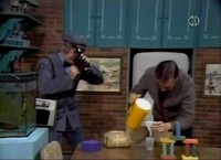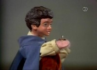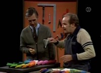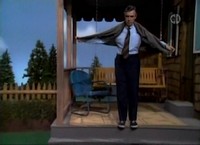 The Neighborhood of Make-Believe storyline is used (with a few changes) as the basis of the book When Monsters Seem Real. Putting on safety goggles before Bob Trow cuts new blocks, Mister Rogers is unaware that the goggle straps find themselves positioned so as to look like two thick eyebrows. Bob Trow points this out and Mister Rogers adjusts the straps. After cutting blocks from a larger piece of wood, Bob Trow carelessly leaves the saw running as he walks away. With safety in mind, Mister Rogers asks "How do you turn this off?" Segments from this week's episodes are featured on the VHS release Dinosarus and Monsters. This episode is included on the DVD Kindness Collection. Appearing In This Episode