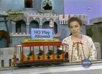 Using the Neighborhood of Make-Believe models in the kitchen, Mister Rogers reviews the previous day's events. In the Neighborhood of Make-Believe, Lady Aberlin is directed to hang "No Play Allowed" signs to remind everyone of King Friday's newest order. While everyone is unhappy about the new rule, no one is more disgruntled than Lady Elaine Fairchilde. After expressing her displeasure to King Friday himself, Lady Elaine moves her Museum Go-Round to an entirely new location. With a few mistaken stops along the way, Lady Elaine finds herself in a place where play is welcome -- a play park where she meets Barbara Russell. Back at the house, Mister Rogers takes the Museum Go-Round model off of the table and then the other buildings as well. Then he does his best to recall where each one was previously located on the empty table. Mister Rogers talks about how Lade Elaine's neighbors must have felt when she left without saying goodbye. With this idea in mind, he sings I Like to Be Told. Mister Roger concludes the day with a film about people moving a real house and by spending a moment playing with the block building and the toy tractor from the previous day. NotesThe wooden blocks used in this episode appear to be the same ones -- in design, at least -- used in Episode 0022 and Episode 1397. Appearing In This Episode