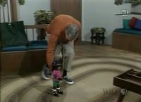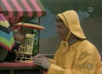 Back inside, Mister Rogers takes out another doll -- a baby wearing a diaper. Taking the doll into the bathroom, he talks about learning to use the potty before he sings Go Stop Go. In the Neighborhood of Make-Believe, Neighbor Aber is wearing a raincoat as Lady Elaine continues squirting water from her hose. At the factory, he helps Corney install an umbrella over the factory. After Neighbor Aber sings I'm a Man Who Manufactures, Corney shares his newest product -- an umbrella Rockit. Moving on to the Museum-Go-Round, Neighbor Aber suggests that Lady Elaine think of other people before she squirts them with water. She finds that others are okay with the small squirts of water if they know about them ahead of time. After Neighbor Aber and Daniel both take a healthy dose of water from Lady Elaine, they sing It's You I Like. Back at the house, Mr. McFeely stops by with a videotape about how people make concrete sidewalks. After the video, Mister Rogers plays a quick game of hide-and-seek with viewers. NotesIn Episode 1649, Corney makes a pretend umbrella Rockit for Daniel's imaginary friend, Malcolm Apricot Dinko. Appearing In This Episode