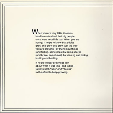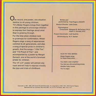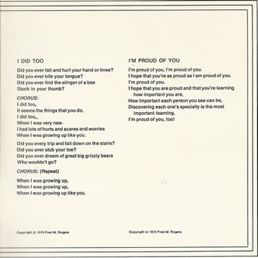 The full box set it also available in LP format on the 1973 Mister Rogers Sings For Those Times When... Appearing On This RecordCreditsWritten and performed by: Fred Rogers (ASCAP) Copyright © 1967, 1968, 1973 Small World Enterprises, Inc. |