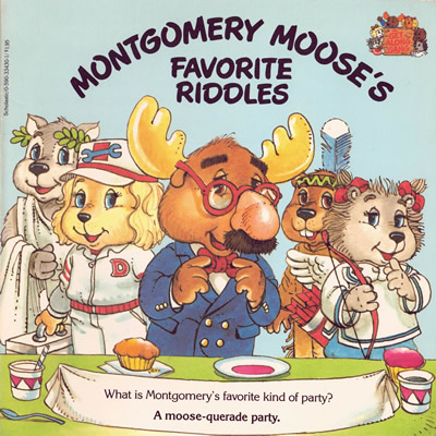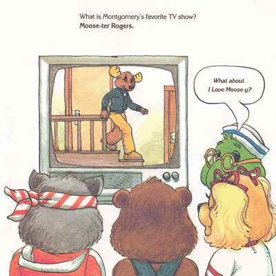 The Get Along GangThe Get Along Gang was a group of colorful animal characters, created by American Greetings in the mid-1980s. Each character had a distinct personality meant to model positive social behavior for kids. They promoted themes like friendship, cooperation and resolving differences through their appearances on greeting cards, toys and in a short-lived animated TV series. One such product was the 19xx book Montgomery Moose's Favorite Riddles which included a variety of silly jokes and puns on each page. A nod to Mister Rogers' Neighborhood can be found within. What is Montgomery's favorite TV show? Moose-ter Rogers.