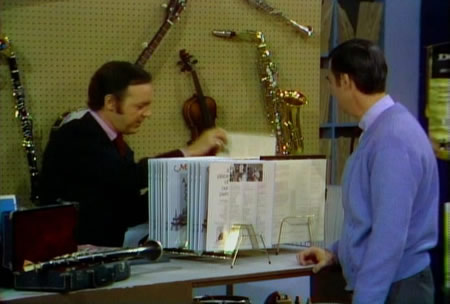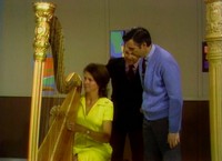 Mr. McFeely stops by and informs Mister Rogers that a local television station will be airing a film about sea gulls and Mister Rogers is in the film. After Mister Rogers plays the Laughs record for Mr. McFeely, they set a timer and wait a full minute for the film about seagulls to begin. They watch the film on a television set near the front door. Visiting Negri's Music Shop, Mister Rogers meets Phyllis Susen who demonstrates different types of harps. Before leaving the shop, Mister Rogers buys a record of harp music. In the Neighborhood of Make-Believe, Lady Aberlin and King Friday watch as Lady Elaine Fairchilde is interviewed on television. Disinterested in Lady Elaine's comments, King Friday changes the channel and suggests that Lady Aberlin go to the Museum-Go-Round. At the Museum, Lady Elaine reveals that while she was on Jupiter, she discovered a new planet -- Planet Purple. After the interview, Lady Elaine shares a "photo" of Planet Purple showing that everything there is purple and everyone looks the same. Back at the house, Mister Rogers talks about how everyone on Planet Purple is the same. He plays his new record of harp music and then a record of accordian music to show that variety is good. He concludes by singing It's You I Like. NotesLet's Be Together Today plays in the background as Mister Rogers goes to Negri's Music Shop. The record of harp music costs Mister Rogers $4.00. Copies of the 1970 release of A Place of Our Own (Album) can be seen on display at Negri's Music Shop. The reporter interviewing Lady Elaine is Jack Bogut. Mr. Bogut was the longtime host of the morning show on Pittsburgh's KDKA radio. In 2011, he was inducted into the Broadcaster's Hall of Fame. The cameraman filming the interview was played by John Butler. Mr. Butler provided audio services on several episodes of Mister Rogers' Neighborhood and occasionally visited the Neighborhood on camera. When King Friday rudely changes the channel on the television set, the TV shows the boring stock program he forced everyone to watch in Episode 1208 and Episode 1209. Appearing In This EpisodeGuests